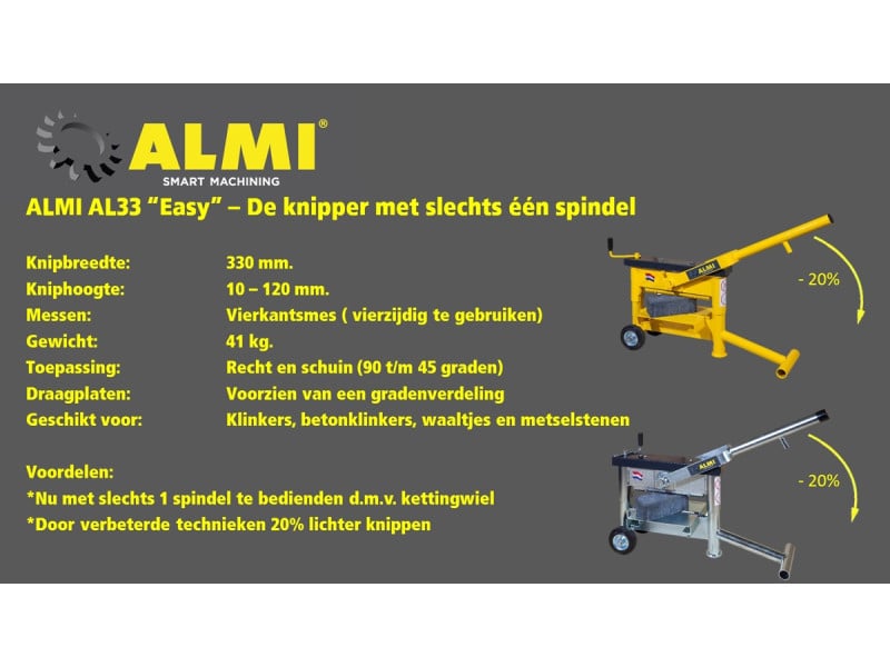 De Almi AL33 Easy is de nieuwste creatie van Almi. Revolutionair aan deze nieuwe steenknipper is dat deze is uitgerust met een kettingwiel. Hierdoor is de AL33 Easy met slechts één spindel te bedienen. En dankzij de verbeterde techniek kun je maar liefst 20 procent lichter knippen.